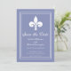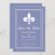 Elegant and simple Wedding save the date invite featuring a fleur de lis against a Periwinkle background. This design is a unique choice for announcing a modern wedding. Easy to customize with your wedding details. Click "Customize It" to find more personalization options.