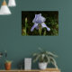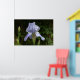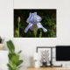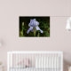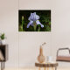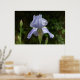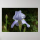 Pretty periwinkle iris with white center and yellow beard and buds ready to open in the background. Raindrops on delicate petals. Green shrubs are blurred in the distance. Original Photography © TamiraZDesigns.
