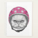 This design features a portrait of a Persian cat with a pink motorcyle helmet.