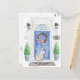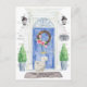 Announce your new address with our stylish announcement featuring a Persian cat, blue front door, welcome mat, slate sign, topiaries and a floral wreath set on a gray brick background.