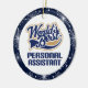 Sports style World's Best Personal Assistant logo in blue and tan comes on a keepsake Christmas holiday gift ornament with gold tie cord hanger and starry blue snowflake sparkles border and back print. Fun occupation stocking stuffer or recognition gift for a personal assistant.