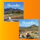 The front photo displays majestic mountain peaks with blue skies above, looking towards Stellenbosch in the background, while the foreground showcases a vegetable garden area enclosed with a thick white wall. The green trees next to the wall, and a road on the inside, with buildings a bit further back, add to the lovely scenery. The back photo features a rocky area with roads or pathways in the foreground, a quiver tree, an orchard with a green hill a bit further back, and mountains in the distance, all under a beautiful blue sky.
