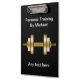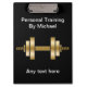 Custom personal trainer clipboards with image of a golden dumbbell and text you can personalize on both sides in this simple clever template. Designed for a workout gym, personal training, or fitness coach.