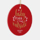 Personalised Christmas ceramic ornament featuring the phrase "Baby It's cold outside", set in an elegant gold and white script text on a red background. The reverse features a hare on a winter scene woodland background with the word love set in a beautiful gold script font.You can personalise with a loved one's name and the year. A perfect gift as a Christmas decoration!