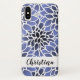 This personalised iPhone X case features seamless floral pattern and customizable name in black handwriting font. Dahlia's petals are filled with blue to black gradient.