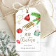 Personalized Christmas tag with watercolor hand-painted illustrations such as sled, snowflakes, Christmas lights, a cup of marshmallows, Christmas foliage, and more Christmas elements. Holiday gift tag. All text is fully customizable.