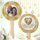 Photo, Personalised Fans for Wedding. PHOTO Wedding Fans, Picture can be Deleted to Expose the same gold heart diamond. Wonderful for your Gold themed wedding. Personalized Hand Fans for Wedding will be wonderful Wedding Souvenirs for guests. Having your Photo, Names and Date make these gorgeous, Custom Wedding Fans even more special. See BELOW on how to TRANSFER this Photo Hand Fan, Design to over 1000 other wedding party favors, wedding party supplies, gifts and so much more. Also, see how you can make CHANGES, with our handy, "EDIT USING DESIGN TOOL. Or call me, Designer Linda: 239-949-9090 EST.