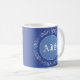 A persons initials on a mug. Gift mug With initials. Attractive mug with a circular flourish which you can personalise with initials of your choice. Blue colour theme.