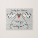 An illustration of 2 beautiful doves holding flowing ribbon with a love heart attached.