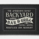 Backyard Bar & Grill, black and embossed silver, retro typography, sign with a funny quote: proudly serving whatever you brought.