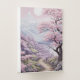 This is a cherry blossom scene with soft pink and lavender trees. The mix of spring colors and cool mountain tones gives the design a calm, nature-inspired feel.