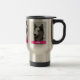 Personalize this Travel Mug with 3 pet photos of your furry family members and their names or 3 photos of the same pet. Three horizontal Fuchsia bars have space for their names in white lettering.