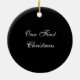 Ornament with a Black Damask pattern on the front with room to add a name and date. The back is black wi th the words "Our First Christmas", which can also be changed to add your own personalization.