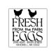 Make this your logo by personalizing it with your name or farm and location. Decorative text reads: - FRESH FROM the FARM EGGS. Two hen silhouettes face each other on top of the words. Great for stamping egg cartons or product labels.