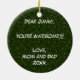 Lightweight, smooth, pure white ornament with nice sheen. Perfect size to be seen from across the room ... and to attract closer inspection! Price was great for ordering enough for the whole family! Clear, bold black design just as requested. Matches the order exactly. Just so nice!