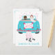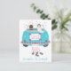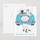 This adorable Just Married wedding announcement post card features a bride and groom driving away in their blue turquoise wedding car with tin cans and flowers surrounded with pink hearts. The card can be personalized with the names of the bride and groom, a family or business name.