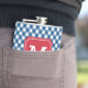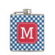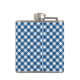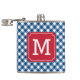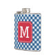 Stylish monogrammed flask featuring a blue gingham pattern. It makes a great personalized gift.