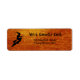 A fun label with a Halloween holiday graphic design of the silhouette of a witch in flight on her broom over an orange textured background.