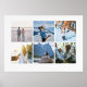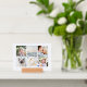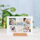 Personalized 12 family photos Universal Greetings Vintage Wood Picture Holder featuring a stylish photo collage with 12 customized images, your greetings message in elegant handwritten script font, your name, date, year, message on the back in a modern and simple sans serif font.