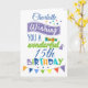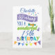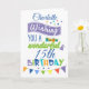 Wish someone a wonderful birthday in style. This bright and colorful card is suitable for a wide range of ages - and the age number can be changed. Features cute typography in a mix of blue, purple and green colors. Small gifts, pennants and stars add to the birthday celebration.