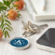 To personalize with name and initial... a stylish single-letter-monogram design on ocean-blue background with custom words 'house keys'