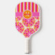 You'll stand out on the pickleball court with this Monogrammed pickleball paddle that has a light pink, hot pink, and orange abstract flowers and stripes pattern on a white background below a pink and white band across the center that has customizable wording on both sides. On top of the pink band is a circle shape in orange and white that is trimmed in hot pink and has a monogram in white and is personalized with your name in hot pink. Above the pink band is a pattern of stripes in pink, orange, and white. Email niteowlstudio@gmail.com with any request for changes.
