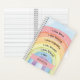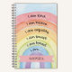 This notebook features the positive affirmations "I am kind, I am brave, I am capable, I am smart, I am loved" and last of all "I am..." with their very own name. Watercolor rainbow in pastel colors on a cloud background.