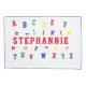 Kids Personalized Alphabet design features a white background to the alphabet in bright, colorful stencil lettering. Child's name is displayed across in red. Also available in blue. Designed to coordinate with the "ABC Baby Shower and Nursery Collection."