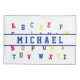 Kids Personalized Alphabet design features a white background to the alphabet in bright, colorful stencil lettering. Child's name is displayed across in blue. Also available in red. Designed to coordinate with the "ABC Baby Shower and Nursery Collection."