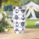 This decorative design features both a dark navy blue anchor and a boat wheel with white stripes. The nautical illustration creates a modern and unique water bottle with personalized text and background color.