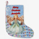 This beautiful Angel stocking with swirling snow and Christmas lights behind her can be personalized with any name you would like