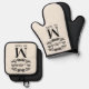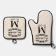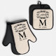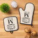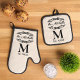 Enhance your kitchen decor with a touch of personal history using this elegant pot holder and oven mitt. Adorned with a chic antique black colored filigree scroll on an ivory background, your family's monogram, and the date of establishment in a black typography style on a cream ivory background, it's not only practical for handling hot dishes but also serves as a personalized artwork that brings some elegance into your home.