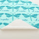 Bold stylized dragonfly named repeat patterned blanket in dark teal, aqua and white. Ideal for making a really personal sewing project for girls who love dragonflies or inked art. Customize with your own choice of name currently reads Linda. The background color can also be changed if required currently aqua. Original inked art and design by Sarah Trett www.sarahtrett.com for www.mylittleeden.com
