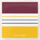 This colorful glass coaster features an autumnal striped pattern in mulberry purple, amber yellow, and white stripes. Personalize it with a name in white at the bottom.