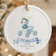 Celebrate your little one’s very first holiday season with a keepsake that will be treasured for years to come. This charming round ornament features an adorable blue reindeer on wheels, accented with soft festive details and a sweet striped background. Personalized with your child’s name and the year, it’s the perfect way to mark such a special milestone.