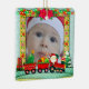 The front features a large, central frame perfect for showcasing a cherished photo, such as a baby's first Christmas picture. The frame is beautifully bordered with festive Christmas lights, elegant poinsettias, and delicate snowflakes. Below the photo, a whimsical Christmas train chugs along, carrying a decorated Christmas tree, colorful gifts, and a cheerful Santa Claus, with snow-covered evergreens completing the cozy winter scene.