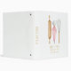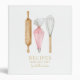 This modern watercolor recipe binder features baking utensils. Gold border. Rolling pin, whisk, piping bag.