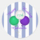 Happy Birthday Stickers, personalized with name and age. Purple, green and white balloons on purple and white striped background.