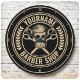 Personalized Barber Shop Rockabilly Skull and Scissors, featuring bearded hipster skeleton hair salon design. Customize with your Name or Custom Text.