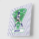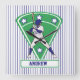 Personalized blue and white baseball star design showing a batter taking a swing in a blue and white baseball jersey uniform with a green baseball field green diamond with blue and white stars in the background. This can be fully personalized with the name of your choice.