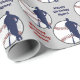 This is cute personalized birthday gift wrap for that guy who is a true baseball fan. It features a blue baseball player and bat silhouette against a white ball image complete with red stitching. The text appears in blue and red, and is easily changed to your own personal message. The images and text are placed on a light silver gray background.