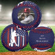 Introducing the Personalized Baseball Player Photo Baseball - the ultimate way to celebrate your love for the game! With this unique and customizable baseball, you can create a one-of-a-kind memento that showcases your favorite player. The modern design features a striking red, white, and blue baseball flag, along with a personalized image of the player. Whether you're part of an All-Star team, a dedicated coach, or a passionate fan, this baseball is perfect for all types of divisions. Get ready to step up to the plate and hit a home run with this personalized treasure!