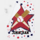 Personalized Baseball bats ball and stars design featuring two crossed baseball bats with a baseball in the middle on a red and blue large star, the background features red white and blue stars and baseballs These products are fully customizable with a name of your choice to create a unique baseball gift.