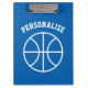 Personalize basketball coach accessories custom sports clipboard. Add your own name, team name or name of club. Nice gift idea for high school coach, mom, dad, kids league, teams, players, fans etc. Ball logo with sporty text template. Blue orange or custom color background. Double sided print.