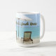 Personalize this beach house mug with names, or any text. Wrap around image of a turquoise sea and two chairs in the sand under an umbrella. Perfect addition to any beach home or vacation house by the ocean.