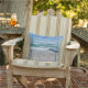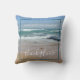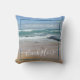 Add coastal style to your beach house with this personalized outdoor throw pillow. The design features a tranquil photograph of the blue and white waves, blue skies and golden sand of coastal Melbourne, in Australia. The modern, white text is customizable so you can add your own family name.