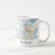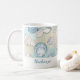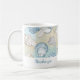 This personalized coastal themed mug features a pattern of hand drawn seashells in shades of blue and brown, with an aqua and sand colored abstract background. If you would like this design on other products, please contact me through Zazzle Chat.