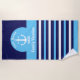 Personalized beach towels are perfect for family beach vacations or family cruise trips. The best family beach vacations create family memories. Save them with personalized beach towels the kids and adults can keep as a souvenir. Personalize with your family name and date. Order for everyone in the family. Navy blue and light blue striped beach towels.