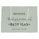 Personalized BEST MAN gift bag with sage green and forest green color palette. The name template is set up ready for you to add the best man's name as well as the bride & groom's names and wedding date. The thank you wording reads "Thank you for being my best man" in a blend of elegant script and strong, bold typography. Please browse our store for alternative colors and size.