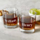 Set of unique personalized whiskey glasses for the groom, his best man, groomsmen, ushers, family member, etc. to celebrate with at his bachelor party, rehearsal dinner, wedding reception and other events. Personalize with their names in a large bold white font and their role or title in simple modern white typography.